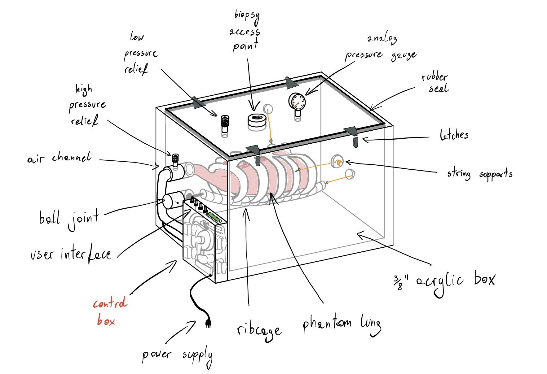 Our design, as shown in the figure above, consists of a cubic prism with ports at the trachea and at the top of the box. The two ports can be used interchangeably for both positive and negative pressure applications, which allow for simulating breathing motion for both the biopsy and catheter robot use. A high-pressure relief valve at the trachea entrance in positive pressure tubing and a low-pressure relief valve on top of the box is placed to prevent dangerous pressure levels within the phantom or the container. Depending on the setup, an air compressor would provide positive pressure air flow to the phantom or a vacuum pump would provide negative pressure airflow from the chamber. A differential pressure sensor between the lung and the chamber is used to determine the pressure within the lungs. An Arduino microcontroller is be programmed to control the motorized valves to match the breathing patterns of human lungs based on pressure data.ย